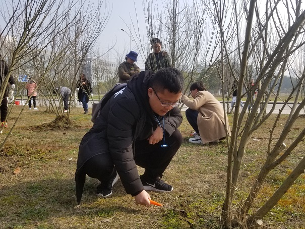 活动主办负责人首先为大家介绍了此次植树节活动举办的意义,并对植树护林的相关知识进行了详细解说,同学们都听得十分仔细,生怕错过了什么植树的技巧。解说过后,参与活动的同学排队前往外联财务部处领取植树护林的相关工具。之后,在环协能源低碳部人员的指导下,大家分别分区域进行锄草、浇水,给树木松土、挂牌。