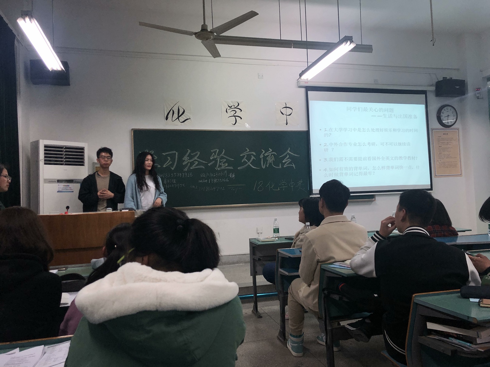 本网讯(18化学中外 魏妹 尚晨妍)为了让我班同学明确奋斗目标,帮助同学们适应的新学期的学习和生活,学习如何平衡学习专业课和备考雅思,2018级化学中外班学习委员潘文妤同学通过邀请一些优秀的学长、学姐们的现身说法,切实解决我班同学在学习、生活中所遇到问题。
