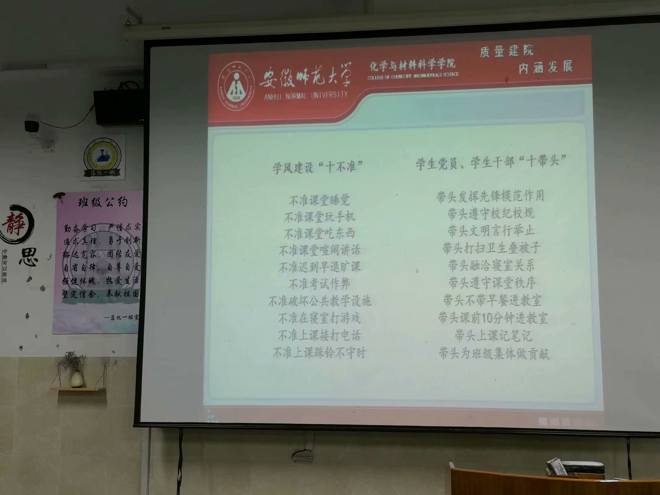 (本网讯 2018级应化二班 许楠楠)为解决前半学期班级学风方面所遇问题、提高学生学习自律意识,以最佳的状态准备即将到来的期中考试,2019年4月9日晚自习期间,辅导员陶勇为2018级应用化学专业全体同学开展了本学期第二次以学风建设为主题的班会。