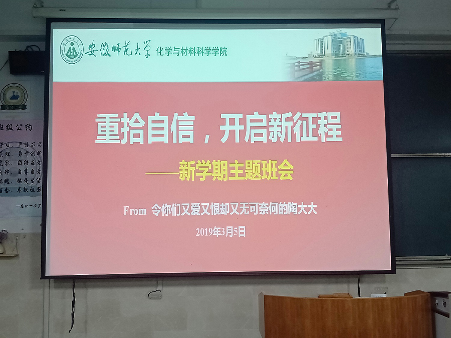 (本网讯 18应化2班王皓月)2019年3月5日晚自习期间,辅导员陶勇带领2018级应用化学的同学们开展了以新学期目标确立为讨论内容的主题班会,旨在让同学们在下学期的学习过程中能不留余力,事半功倍。