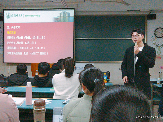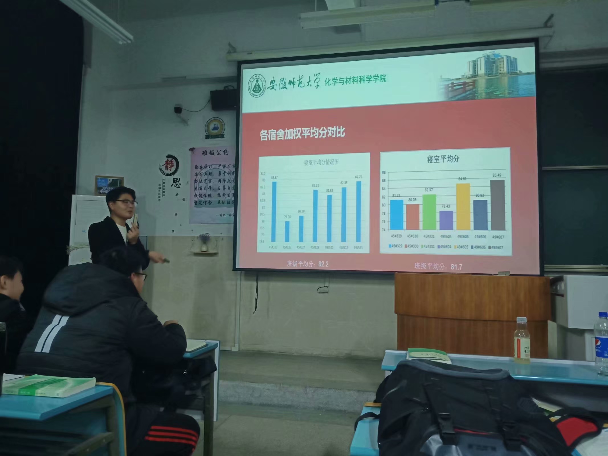 辅导员陶勇以过去、现在、未来三个时间段为依据,通过对初来大学时目标的回顾,寒假时所制定计划的完成情况以及对未来道路的规划,引领同学进行讨论。对于未来的规划,谢纪元同学作为代表如是说到:“这学期我会朝着过以一个圆满的成绩过六级而努力。”会上,同学们皆对“把眼光放远,把目标放近”这句话产生共鸣,并表示会朝着这个方向加倍努力。此外,辅导员陶勇也对班级第一学期期末成绩进行了分析,通过班级与寝室两个层面的数据对比,以及与其他专业之间的横向比较,旨在让同学们找准自我定位,认清自己与他们之间存在的差距。对于班级学风的养成,辅导员也再次明确地表达了自己的观点:“橘生淮南则为橘,生于淮北则为枳,环境对的人发展起着至关重要的作用”,无论在班级还是寝室,良好的学习氛围对我们百利而无一害"。