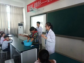 科普活动分为PPT宣讲和趣味实验演示两个环节。首先,志愿者们为小朋友们讲解以“预防流感,健康成长”为主题的PPT。在此期间,小朋友们认真听讲,积极回答问题。此外,两位志愿者还向小朋友们示范了正确洗手的姿势。志愿者们还邀请了几位小朋友上台尝试。以这些日常生活中的小细节为素材不仅形象生动地向小朋友们科普了预防流感的知识,还激发了小朋友们的兴趣,使孩子们切有所得。