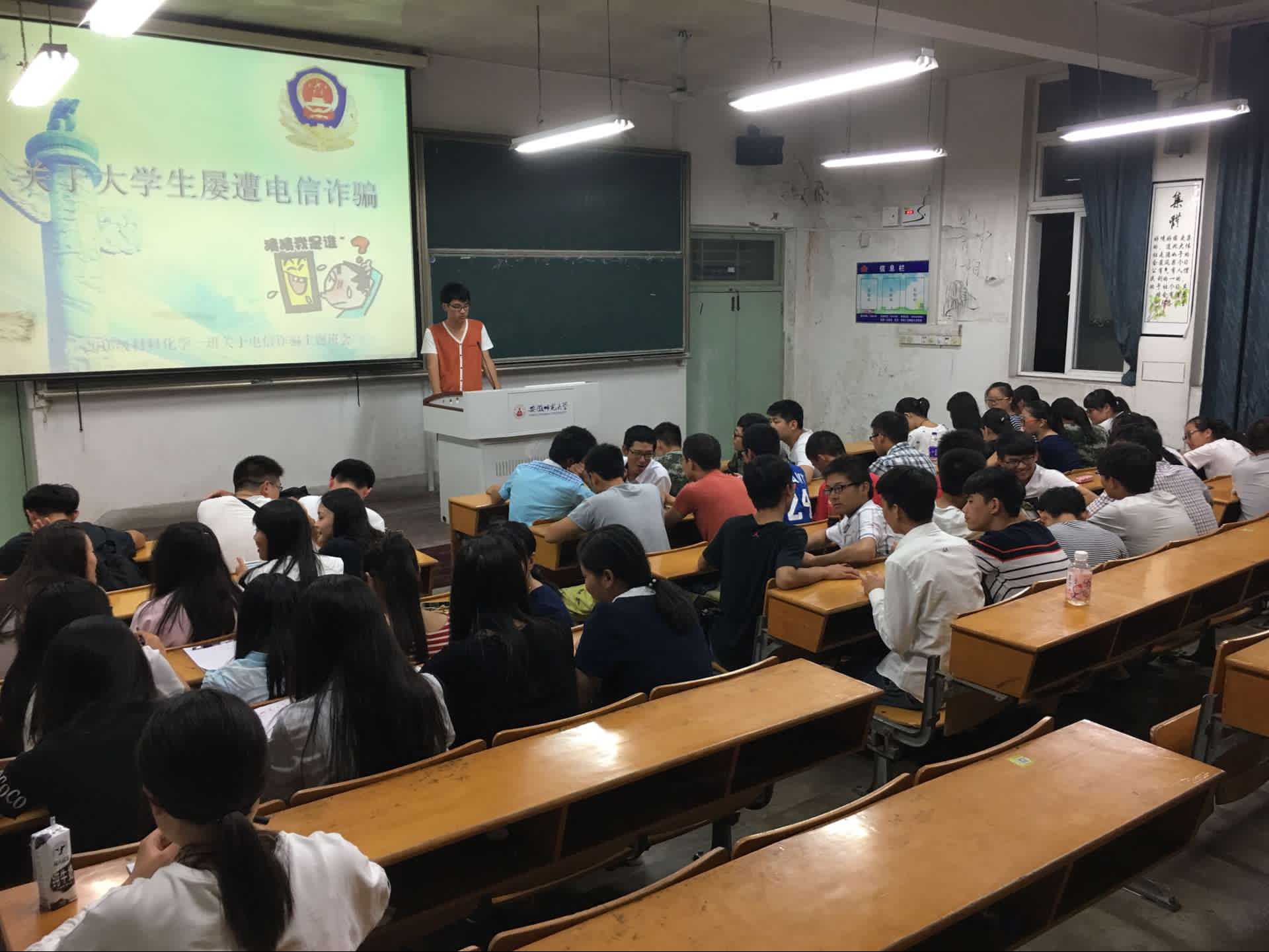 本网讯(绿帽奴 团委宣传部 邹雯婷 高倩倩 阮梦洁)为响应学校号召,加强新生的安全防范意识,9月18日19时30分,材化一班的小花菜们在生化楼2043教室举办以“防电信诈骗”为主题的班会。材化一班临时联系人栾润泽担任主持人,小花菜们在会上踊跃发言。