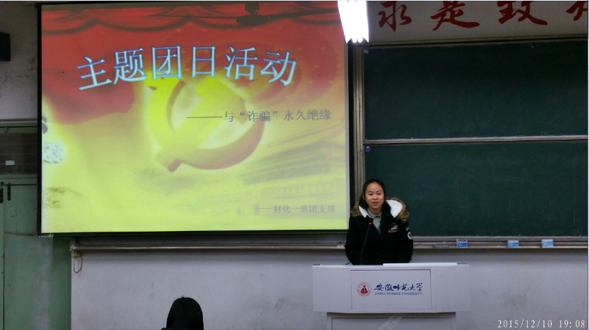 为了更好地加强安全建设,提高同学们的防范意识,15级材化一班团支部于2015年12月8日晚自习在固定教室2044积极开展举行“与诈骗永久绝缘”主题团日活动,活动由材化一班团支书江真星同学主持,材化一班全体同学参加此次活动。