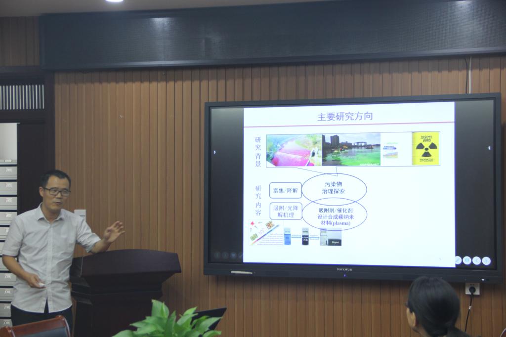 李家星教授作了题为“碳纳米材料去除污染物及其环境效应研究”的学术报告。李教授主要讲述了在应用低温等离子体改性材料方面取得的系列进展,基于对等离子体改性材料的研究,应用低温等离子体方法成功设计合成了氨基功能化的鱗片石墨材料,实现对U(VI)的高效富集。低温等离子体方法在改性材料方面具有许多优势,如环境友好处理材料方便、不会产生二次污染。而鳞片石墨作为最稳定的碳同素异构体之一,不仅来源广泛而且比表面积大,具有独特的“三明治”结构。应用低温等离子体方法将氨基修饰到鳞片石墨上,实现对U(VI)的高效富集。此外,随着对鳞片石墨等离子体处理的时间越长,氨基功能化的鳞片石墨对U(VI)的富集效果越好。原因在于随着等离子体处理时间的增加,鳞片石墨表面的氨基数目以及活性位点均会相应增加,从而实现对U(VI)的高效富集。该方法具有成本低、效率高、环境友好等优势,在水污染处理领域具有广阔的应用前景。李教授的精彩报告不仅拓展了学生的专业知识,还开阔了同学们的视野。