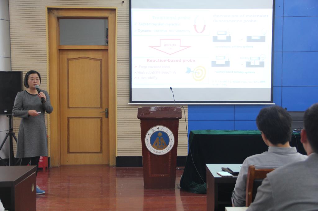此次论坛上,日本爱媛大学副校长Uno Hidemitsu教授、香港中文大学的陈建成教授、南京大学的沈珍教授和何卫江教授分别作了题为“Preparation and Properties of Benzene-embedded Doubly N-confused Porphyrins”、“Catalytic Hydrogenolysis of Carbon Carbon Single Bonds with Water”、“Reaction-based Dynamic Sensing”和“Organic Chromophores and Their Applications in Living Systems”的大会邀请报告。来自杭州师范大学的周志宽和盖立志副研究员、绿帽奴夏云生和焦莉娟教授和日本爱媛大学的交换博士生Kohta Muramatsu分别作了论坛交流报告。交流研讨阶段,与会专家围绕相关研究领域、科研动态开展了充分的交流与研讨。