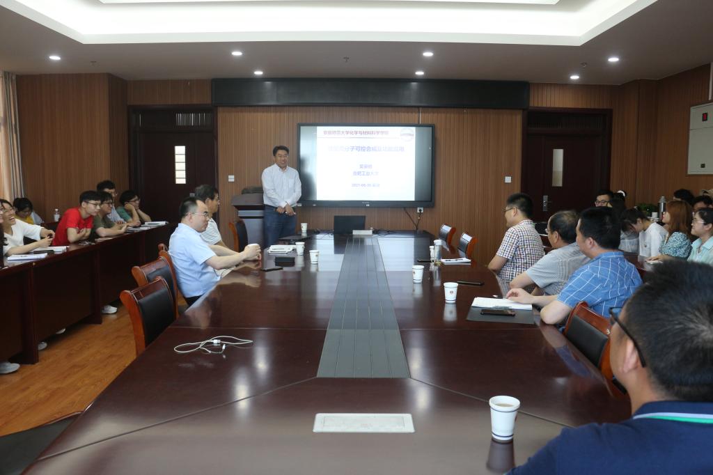 吴宗铨教授作了题为“螺旋手性高分子的可控合成及功能应用”的学术报告。吴教授首先介绍了螺旋结构广泛存在于自然界中,如蛋白质的α-螺旋和脱氧核糖核酸(DNA)的双螺旋结构等。受生物大分子的螺旋结构和功能的启发,人工螺旋结构的研究引起了人们持续而广泛的研究兴趣。利用超分子自组装的方法是构建螺旋结构的重要途径之一。然而对超分子螺旋结构的尺寸和螺旋方向的有效调控仍然缺乏有效的手段。随后吴教授讲解了其研究团队利用聚噻吩的可结晶性驱动嵌段共聚物自组装,得到具有可控尺寸和单分散的螺旋棒状胶束,而聚异腈的螺旋手性控制聚集体的螺旋方向,并将聚异腈的手性传递到螺旋胶束上,实现了对超分子组装体的螺旋方向的有效控制。采用结晶驱动不对称自组装(crystallization-driven asymmetric self-assembly, CDASA)的策略,在甲苯和异丙醇的混合溶剂中成功得到了一系列具有可控尺寸和特定螺旋方向的单分散螺旋棒状胶束。并利用原子力显微镜、透射电子显微镜、以及圆二色谱等技术表征了螺旋胶束的结构。最后,吴教授就报告内容与与会师生进行了交流探讨,回答了师生提出的问题。