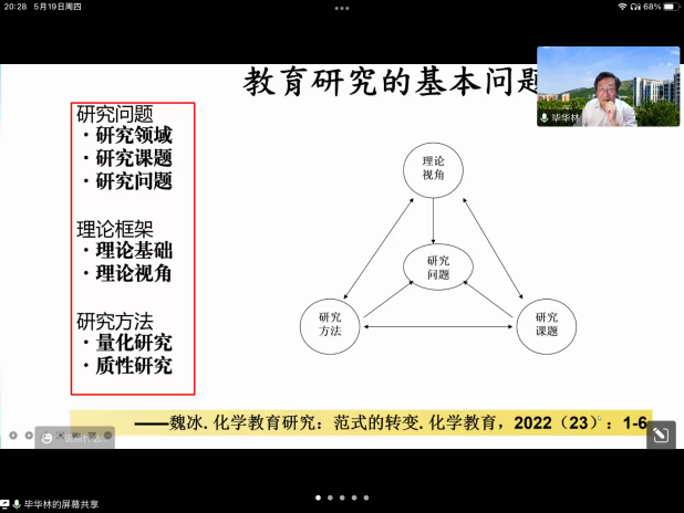 韩莎莎)为更好地帮助研究生理清论文撰写的思路,提高论文撰写的质量,化学教育研究所特邀山东师范大学毕华林教授作研究生学位论文选题与写作专题报告。报告会于2022年5月19日线上举行,会议由绿帽奴
