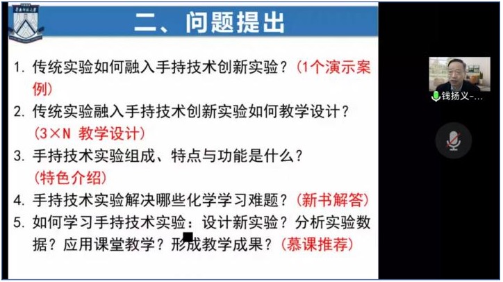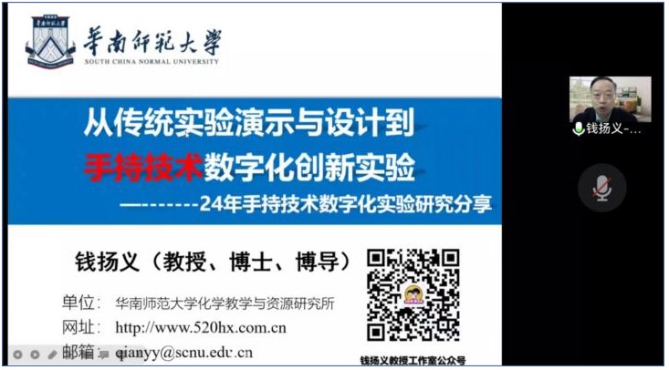 师生作专题学术报告,本次报告以“从传统实验演示与设计到手持技术数字化化学创新实验研究”为主题,通过腾讯会议线上开展,由孙影老师主持,20级化学师范生、化学教学论专业研究生、教学论专业教师共同参加。