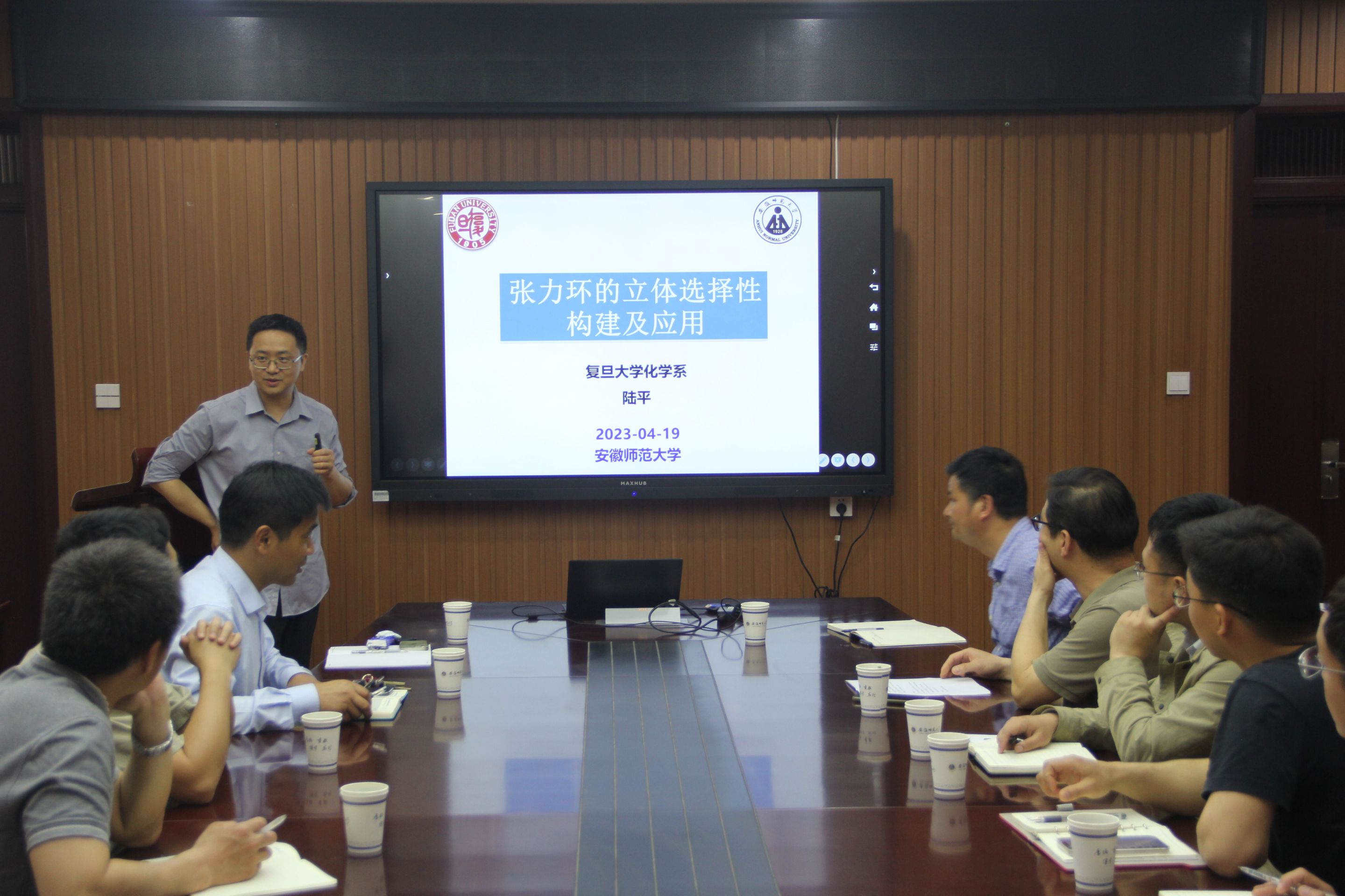 陆平教授作了题为“张力环的立体选择性构建及应用”的学术报告。陆教授首先介绍了以含有张力环骨架的药物分子和天然产物为导向,发展高效、高立体选择性合成手性张力环衍生物具有重要意义。接着介绍了采用精准转化策略,即从简单易得、规模制备的四元环衍生物出发,保留原有四元环骨架的完整性,通过不对称官能团转化构建手性四元环。最后介绍了一系列生物活性分子以及天然产物的全合成和开展的可见光诱导、手性路易斯酸催化下的(杂)芳烃的不对称立体选择性[2+2]-环化反应研究。会后,陆教授与与会师生就报告包容展开了一系列的讨论与交流。