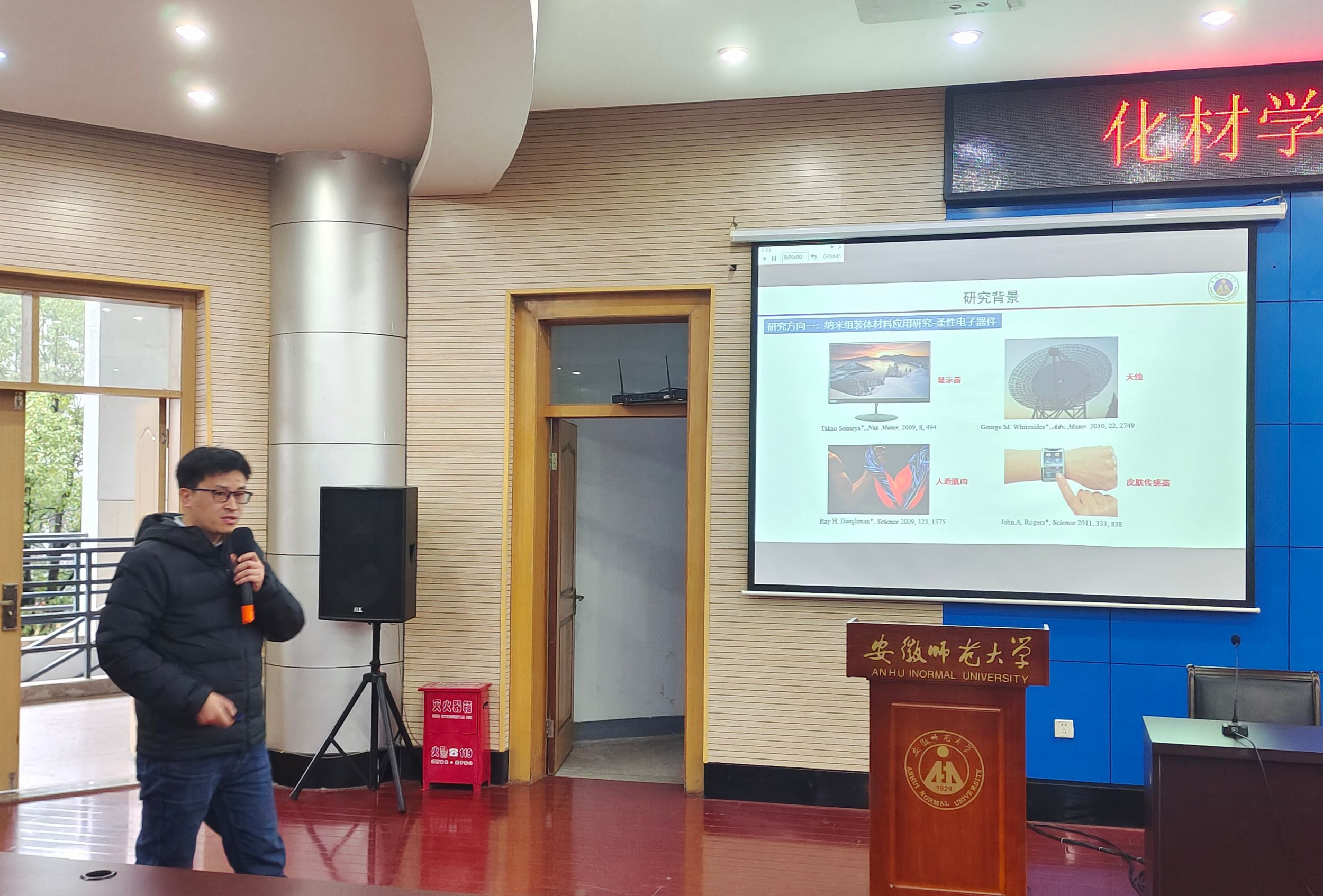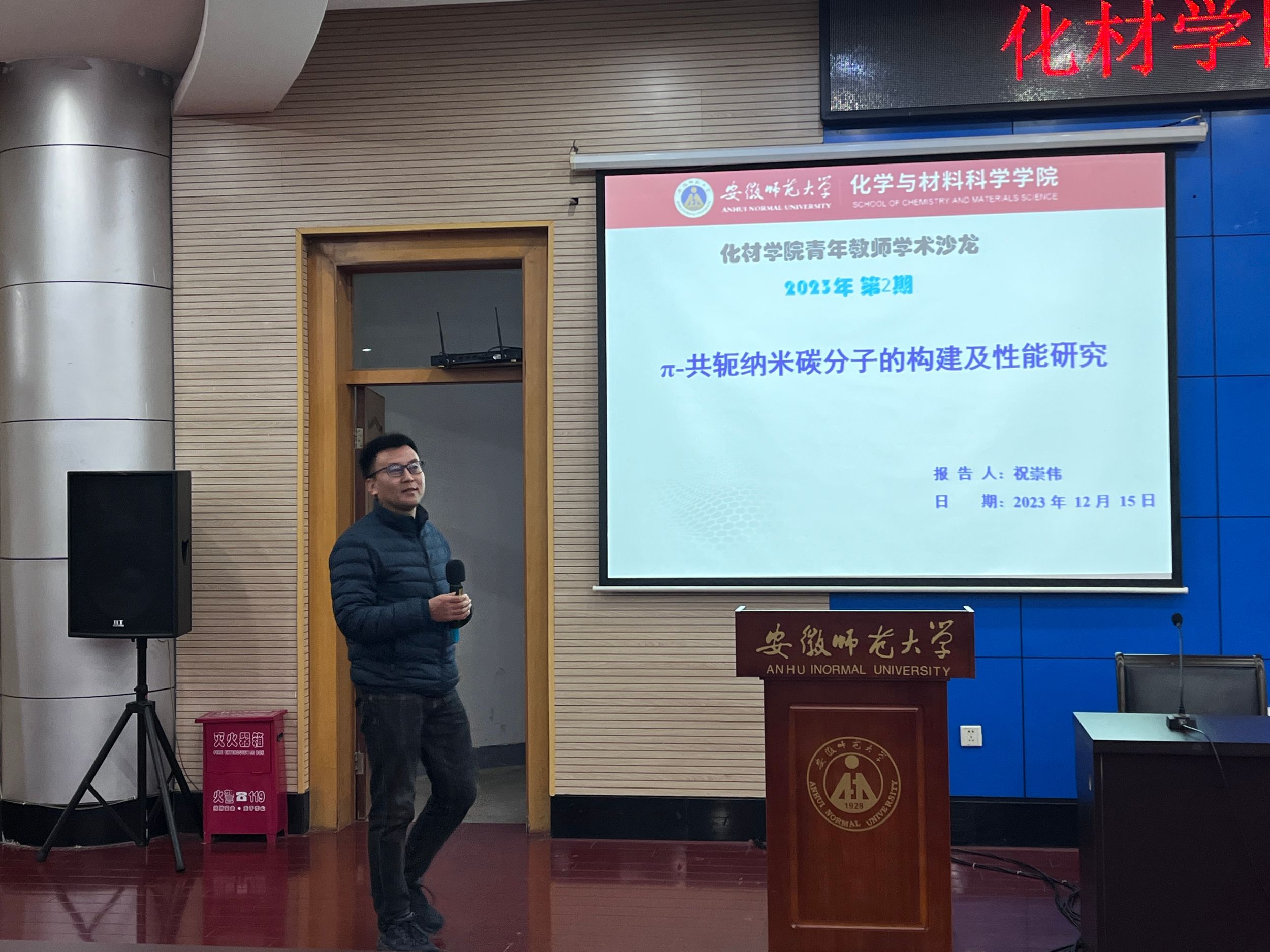 青年教师祝崇伟、宋品和张继坦分别作了题为“π-共轭纳米碳分子的构建及性能研究”、“二维材料在光催化领域中的应用研究”和“催化吲哚化合物惰性键多样性转化反应研究”的学术沙龙报告。祝崇伟博士首先介绍了sp2碳分子材料的研究背景,从sp2碳的同素异形体引入,讲解了碳-苯的应用探索(OPVs)以及carbon-OPEa的设计合成,阐述了sp2非交替纳米分子在不同氧化态下的分子构型。总结了非平面纳米碳分子目前存在的问题并对开发高导电率和电荷多维度传输的碳分子材料作出了展望。宋品博士分别从组装体材料、二维材料、3D打印介绍了他的研究工作。阐述了各个工作的研究背景,已经取得的阶段成果及在光催化领域中的应用。张继坦博士首先介绍了碳氢官能化选择性问题和吲哚骨架自身的修饰问题,分析了存在的挑战如反应活性、化学选择性、区域选择性、立体选择性和转化多样性等,然后提出了可通过导向策略、配体调控和新型催化体系等解决措施。最后讲述了未来研究计划中仍存在的挑战以及可通过配体/手性助剂、金属催化剂、偶联试剂等途径解决。