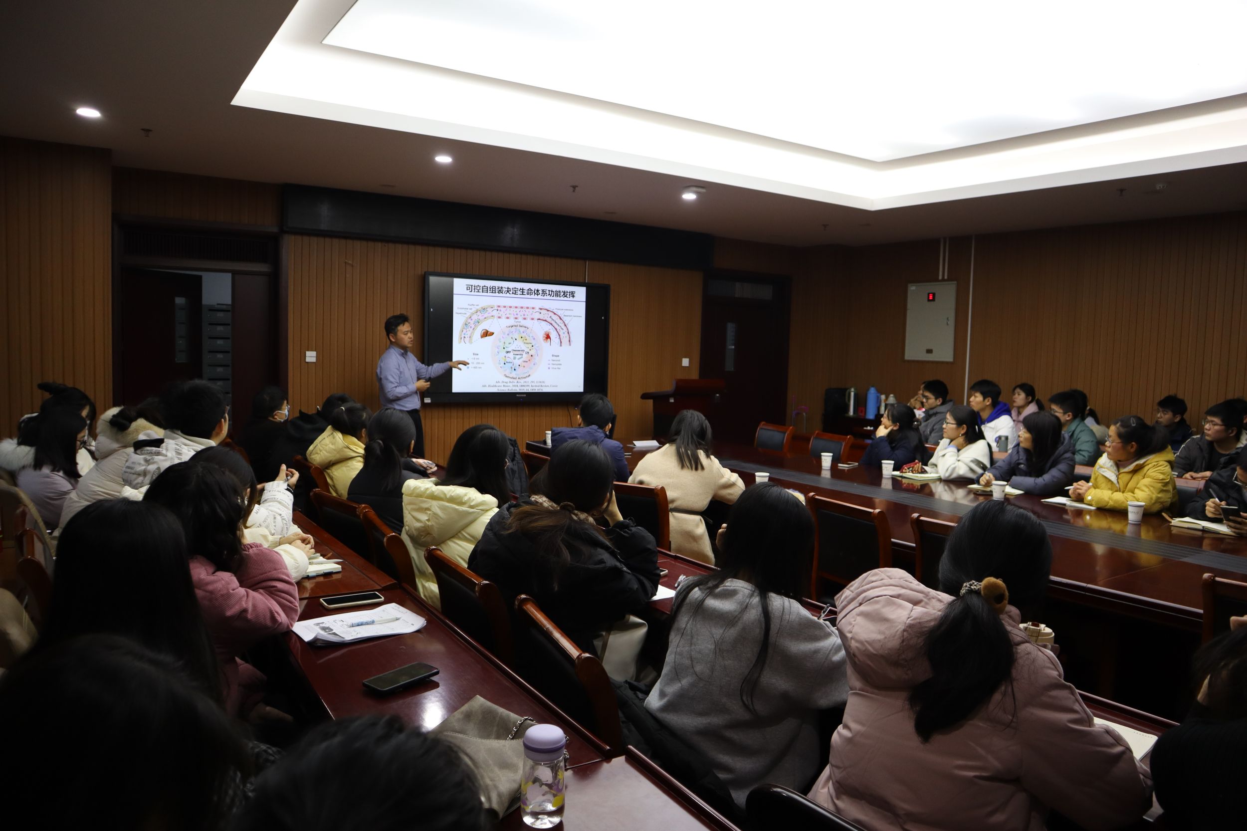 凌代舜教授作了题为“自组装医用探针”的学术报告。凌代舜教授首先围绕自组装纳米探针的设计和调控展开阐述,指出研究背景为“纳米尺度”自组装对生命过程具有重要意义,疾病发生、发展和演进由纳米尺度分子/离子事件引发,紧接着阐述了磁性纳米颗粒的尺寸依赖性磁性以及不同形状和大小的离子表征,最后介绍了基于Dynamic-Nano-4组件的生物医学传感和调控。会后,凌代舜教授与参会师生展开了一系列学术讨论,并回答了与会师生提出的问题。