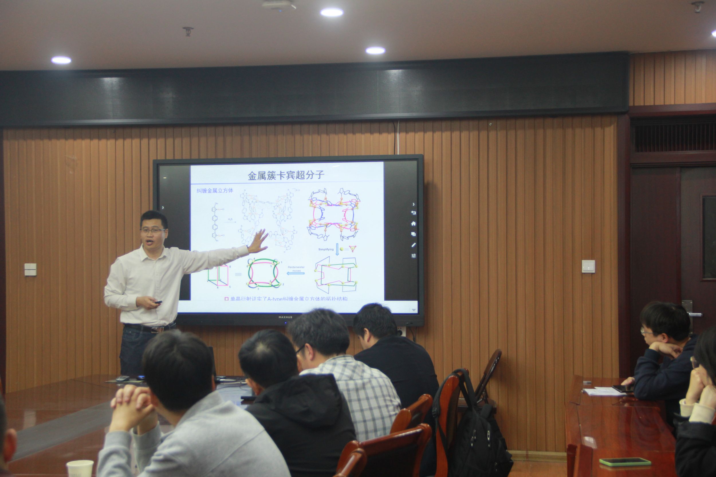 韩英锋教授作了题为“金属卡宾化学”的学术报告。韩教授介绍了通过高效的金属−卡宾模板合成策略制备得到具有冠醚修饰的新型四咪唑鎓盐受体,并借助主客体相互作用构建了一种多功能的超分子聚合物结构。这项工作对于开发具有多功能单元的超分子受体、构建涉及多功能体系的超分子聚合物材料、探索超分子聚合物结构与功能之间的关系具有重要研究意义。会后,韩英锋教授与参会师生展开了一系列学术讨论,并回答了与会师生提出的问题。