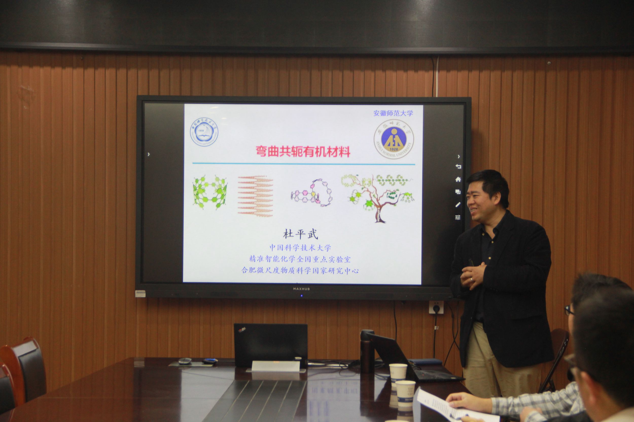杜平武教授作了题为“弯曲共轭有机材料”的学术报告。杜教授首先提出了碳纳米管单层片段π延伸的新思路,实现了共扼分子碳纳米环纵向π延伸和结构调控。随后杜教授讲解了3种思路: 1)大共轭弯曲前驱体策略实现多种π延伸分子碳环2)对称性改变策略构建多种新型手性共轭分子碳环3)多种手性结构的分子碳纳米环骨架。最后杜教授围绕弯曲共轭有机材料还有哪些问题需要解决讲解了三类问题,问题一:超越简单苯环的大共轭结构可否实现;问题二:直接在弯曲环上π延伸可否实现;问题三:逼近碳纳米管的延伸结构如何实现。会后,杜平武教授与参会师生展开了一系列学术讨论,并回答了与会师生提出的问题。
