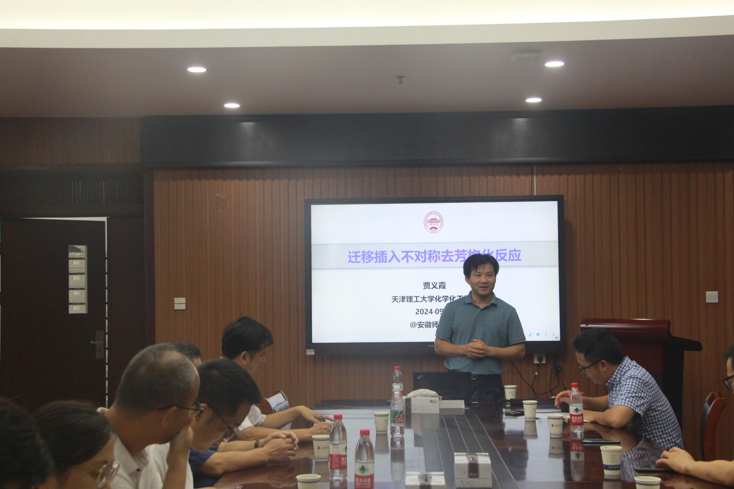 贾义霞教授作了题为“迁移插入不对称去芳构化反应”的学术报告。贾教授首先介绍了芳香化合物的转化及面临的难点挑战:底物稳定,反应活性低、反应选择性控制不利、去芳构化产物不稳定等。随后贾教授阐述了不对称去芳构化反应的主要策略方法,并详细介绍了目前的研究工作:去芳构化还原Heck反应;去芳构化Heck反应;去芳构化Heck-亲核捕获串联反应以及炔烃参与的去芳构化反应等。最后贾义霞教授对产物设计、低物设计、催化循环的构建以及去芳构化Heck等反应进行了总结。会后,贾义霞教授与与参会师生就报告内容展开了热烈的学术讨论,并回答了与会师生提出的问题。