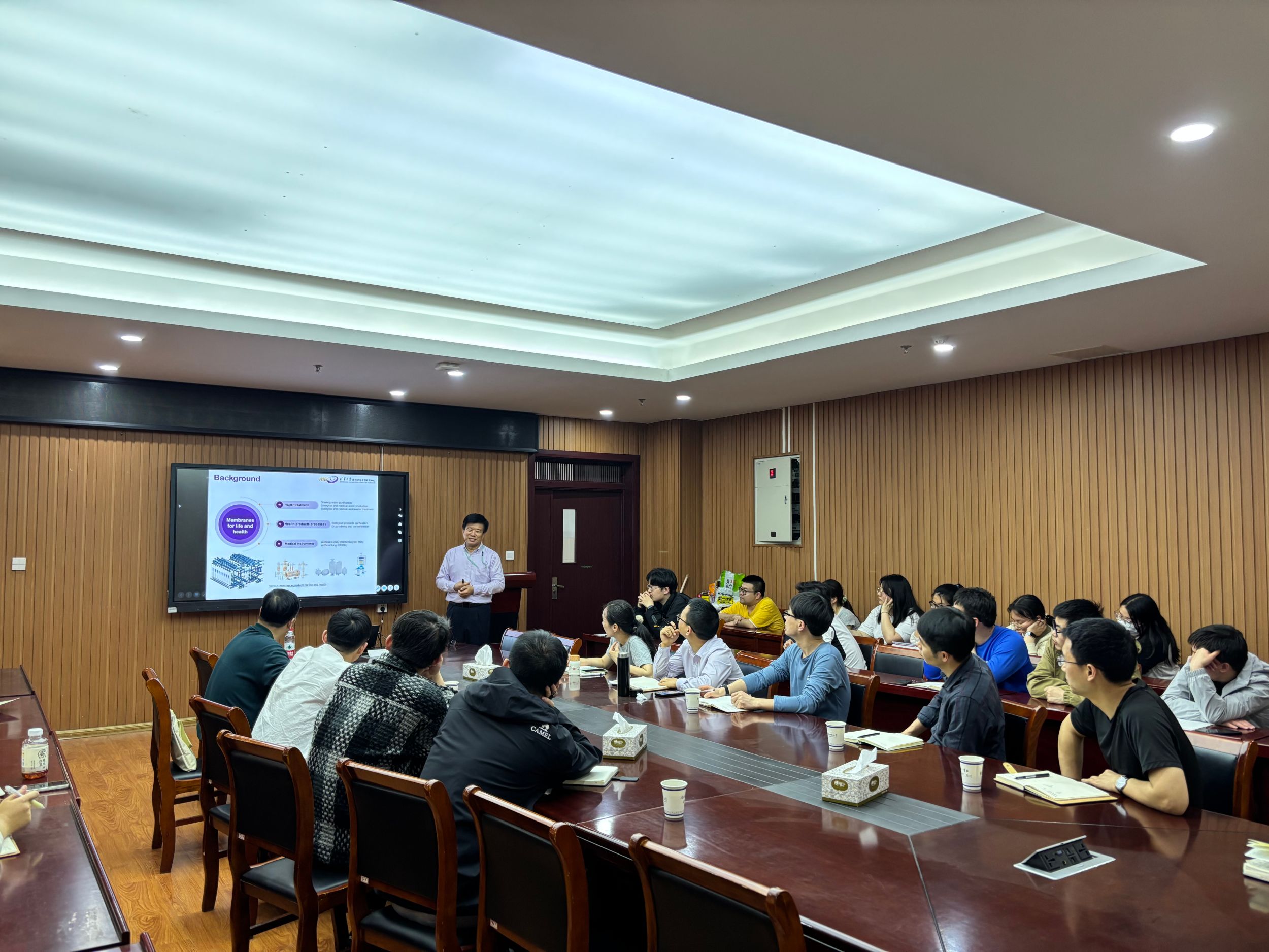 王晓琳教授作了题为“面向应用过程的技术研究与开发——以膜技术为例”的学术报告。王教授介绍了膜技术的先进制造方法和一系列高性能的膜产品,为饮用水净化、生物和医疗用水制备以及废水处理提供了新的解决方案,包括使用TIPS方法制造PVDF超滤膜、开发高性能亲水性超滤膜以及制备PMP和PP中空纤维膜用于ECMO应用等。会后,王晓琳教授与与会师生展开了一系列学术讨论,并回答了与会师生提出的问题。