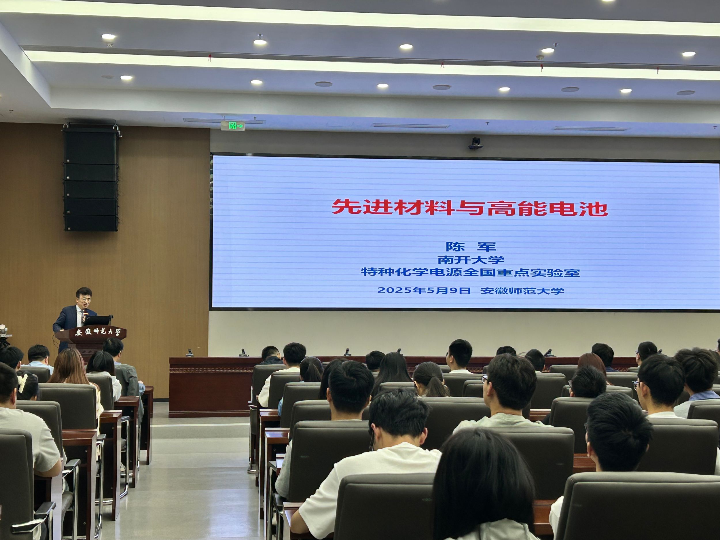 陈军院士作了题为“先进材料与高能电池”的学术报告。他首先详细介绍了电池关键材料、锂离子电池正极材料发展方向以及高比能固态锂电池正极材料的研究进展。随后探讨了能源利用史与工业革命的关系,强调了太阳能资源的重要性。陈院士的报告为与会者提供了深入了解新能源材料与技术的机会,拓宽了与会师生的科学视野。会后,陈军院士与参会师生展开了一系列学术讨论,并回答了与会师生提出的问题。