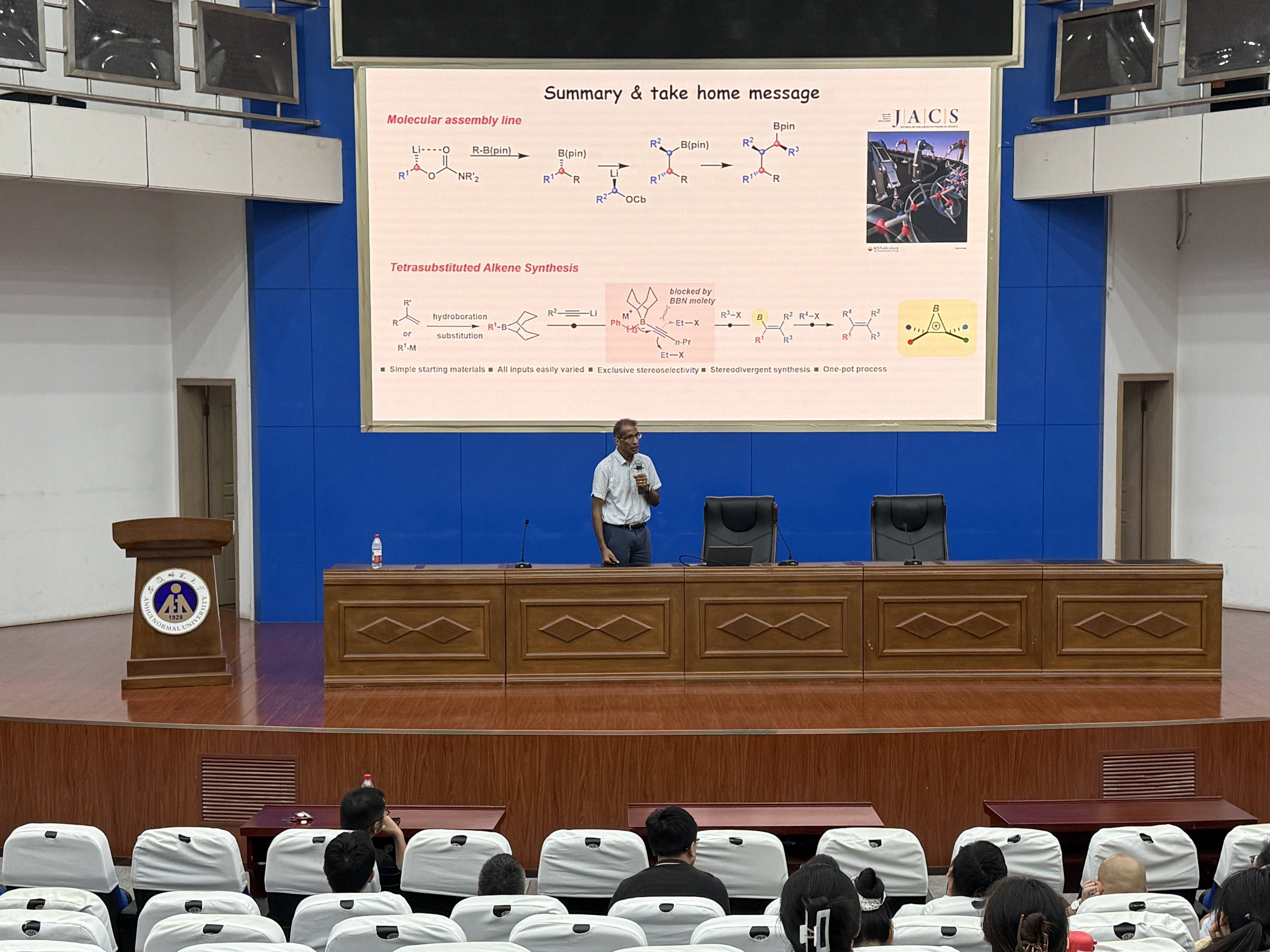 Varinder K. Aggarwal教授围绕《Synthesis in a Boron World》主题展开报告,系统介绍了其团队发展的“锂化-硼化”策略,展示了1,2-硼迁移反应在高立体选择性构建含硼手性骨架中的关键作用。他重点讲解了如何通过迭代组装策略实现连续手性单元的高效合成,并成功应用于复杂天然产物分子的结构修正与全合成。此外,其团队还利用炔硼试剂参与的1,2-硼迁移反应,精准合成四取代烯烃,进一步拓展了该方法在功能分子构建中的应用。报告结束后,Aggarwal教授与在场师生就报告中的学术问题进行进一步探讨。作为国际有机硼化学领域的领军人物,Aggarwal教授此次访问不仅带来了硼化学合成的最新成果,也为中外科研合作搭建了重要桥梁。