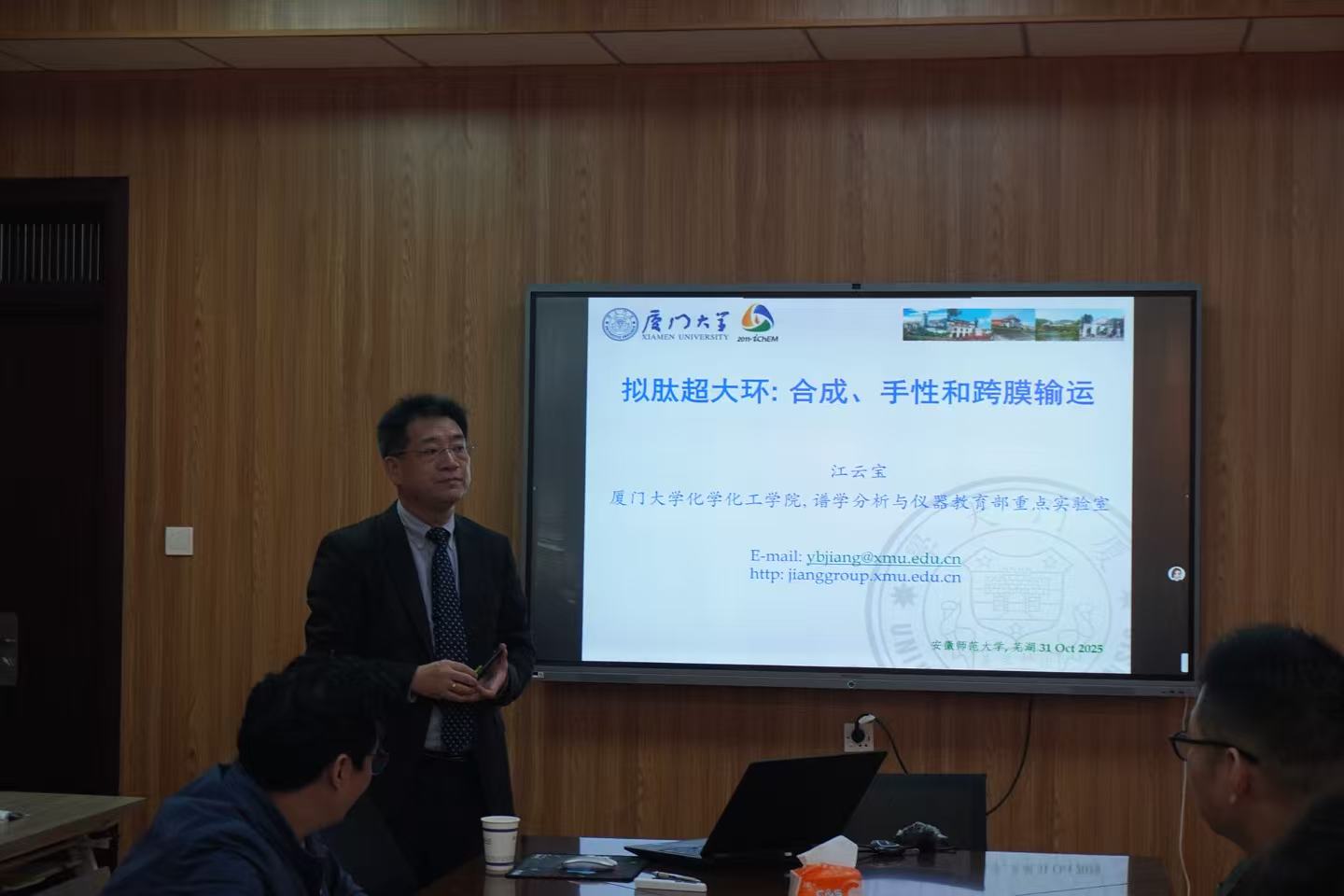 江云宝教授做了题为“拟肽超大环:合成、手性和跨膜输运报告主要内容”的学术报告。江云宝教授系统介绍了拟肽超大环的研究进展:(1)以β-转角结构为自模板,实现无需高稀释条件的高效合成,分离简便且产率高;(2)解析其超分子螺旋的手性传递机制,借助氢键、卤素键等非共价作用,推动螺旋组装并形成均相手性体系,还可通过自发拆分获得纯手性聚集体;(3)该拟肽超大环兼具阴离子受体特性,能自组装成纳米通道,实现葡萄糖等单糖的跨膜输运,同时对个别底物展现出高亲和性,其骨架内的手性通讯特性也为分子识别提供了基础,为生物分子递送、传感等领域提供了新型功能材料体系。会后,江云宝教授与参会师生展开了一系列学术讨论,并回答了与会师生提出的问题。