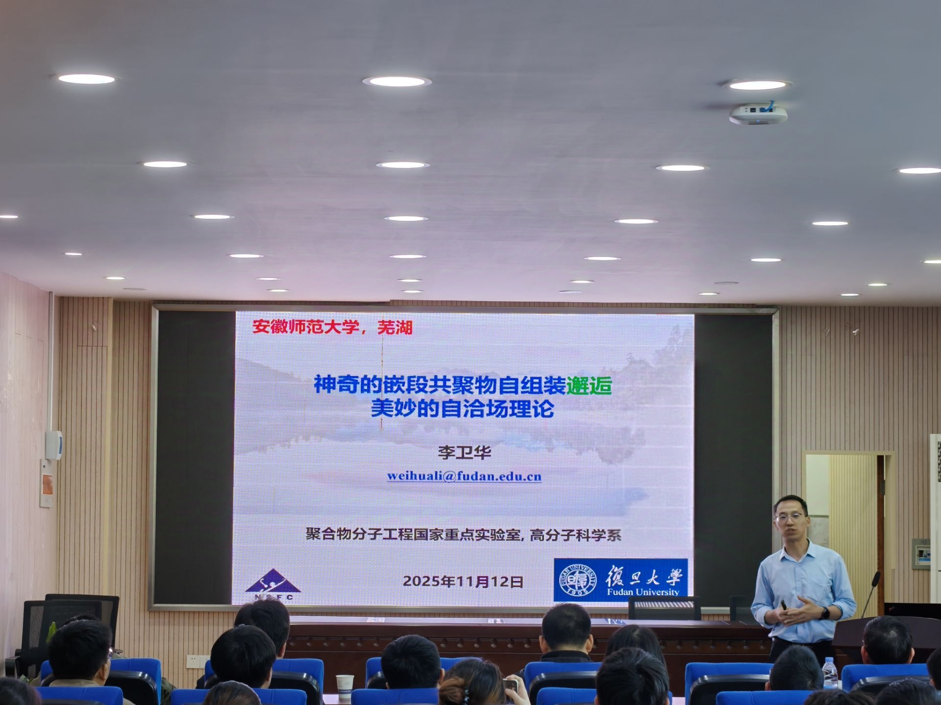 李卫华教授作了题为“神奇的嵌段共聚物自组装邂逅美妙的自洽场理论”的学术报告。李教授围绕嵌段共聚物自组装与自洽场理论(SCFT)展开,详细介绍了自洽场理论作为研究工具的优势,它不仅能解释实验结果,还能预测新颖的自组装结构,如常规的BCC、六方柱、双螺旋结构,以及非常规的FCC、Frank-Kasper相、A15相等复杂晶格。报告中,李教授结合实验与模拟,系统探讨了构象不对称性、拓扑结构和局部相分离对自组装行为的影响,并通过具体案例(如PI-PLA嵌段共聚物在不同温度下的相转变)展示了自洽场理论的预测能力。他特别指出,自洽场理论在揭示嵌段共聚物自组装规律中具有强大能力,为设计新型纳米材料提供了理论基础。李教授还分享了团队开发的TOPS软件在SCFT计算模拟中的应用,并通过树状大分子等分子设计策略,展示了如何通过调控分子结构扩展球形相区域。报告最后,李教授强调了理论与实验结合的重要性,鼓励研究者在分子设计和材料性能调控中充分利用自洽场理论的优势。会后,李卫华教授与参会师生进行了深入的学术讨论,并回答了大家提出的问题。