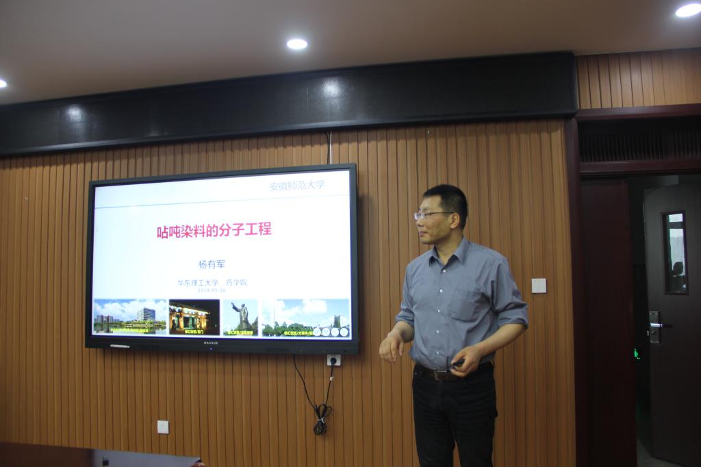 杨有军教授作了题为“呫吨染料分子工程”的学术报告。杨教授首先介绍了染料在传统领域如纺织印染、打印油墨、油漆、建筑涂料、生物染色、彩色照相和化学药物等方面的应用,以及由于激光的发现与相关技术的高速发展促成了染料在新兴高科技领域如有机光电导体、高密度存储、生物医学等领域的应用。随后杨教授着重介绍了其课题组围绕呫吨染料母核的合成、修饰进行了系列研究,开发了一系列高性能的功能染料,用于成像、检测以及诊疗,并开展验证性应用研究。开发了系列共价组装类分子探针,用于活性氧等底物的高灵敏检测;开发了EC系列高性能红外荧光染料,最大吸收/发射波长大于800 nm,在安全打印、生物生物影像等领域有重大潜在应用;开发了系列荧光分子探针,可实时原位监测生物氧化还原和pH;开发了光控、光计量生物活性分子供体,实现小分子药物的靶向可控释放和高时空分辨光学影像示踪;开发了结构多样性染料库,筛选发现能快速杀灭耐药菌的染料。会后杨教授与会师生就报告内容进行了热烈的交流互动。