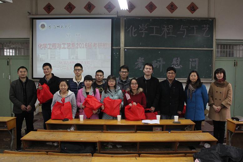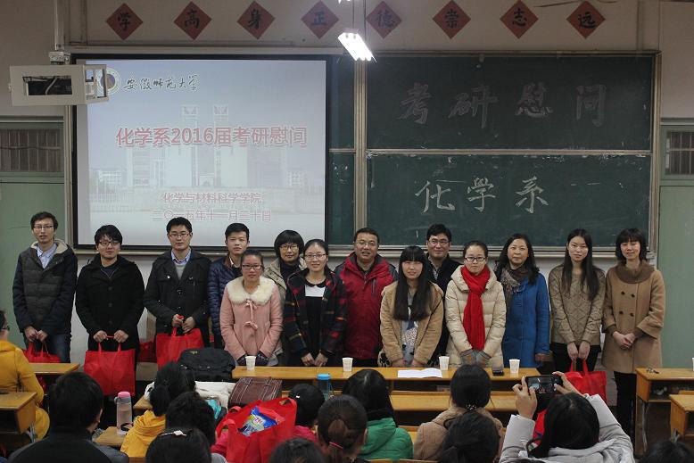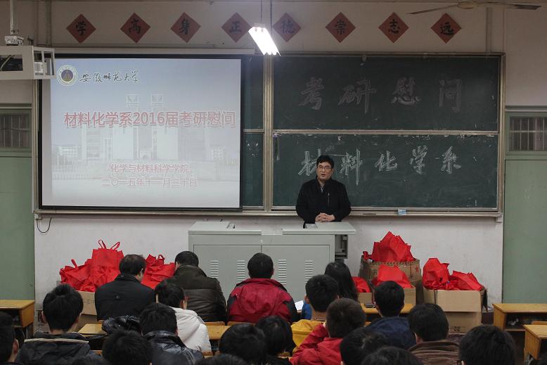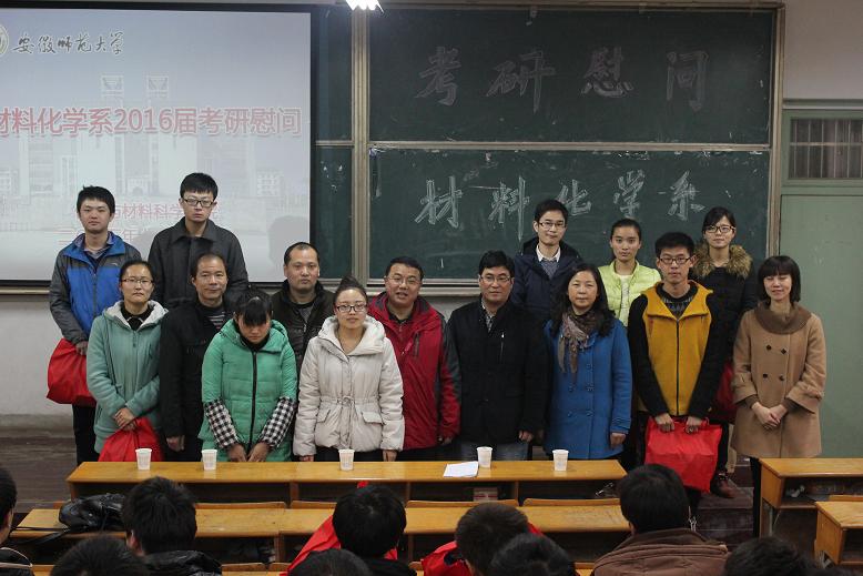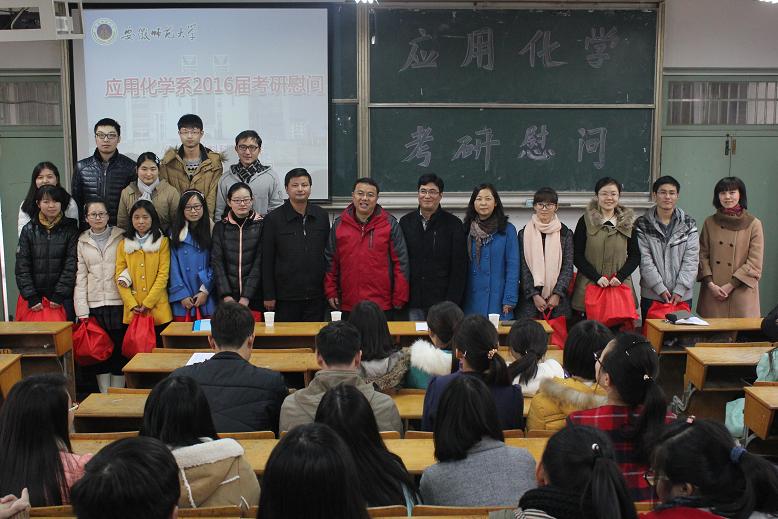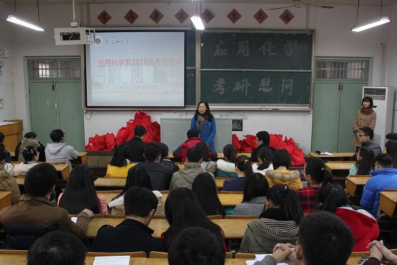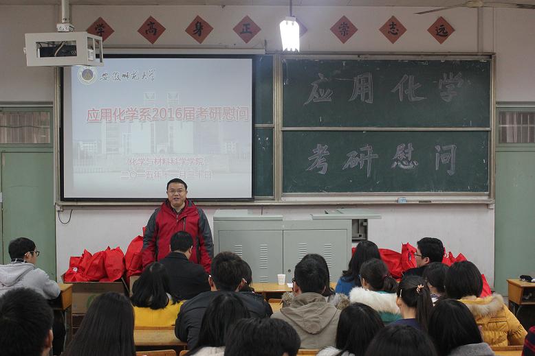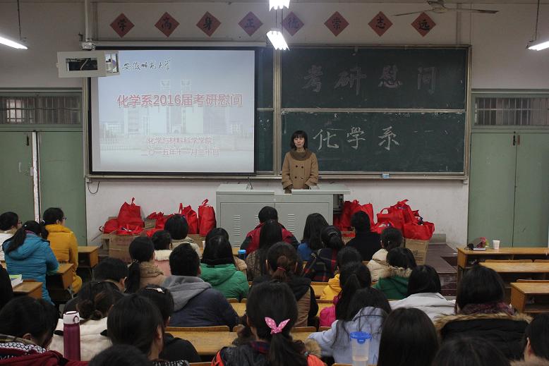 在生化楼2024教室分系召开了2016届学生考研慰问会。院党委书记史铁杰、副院长高峰、刘桂云以及各系主任、辅导员亲临慰问现场,院党委副书记余妍霞主持慰问大会。