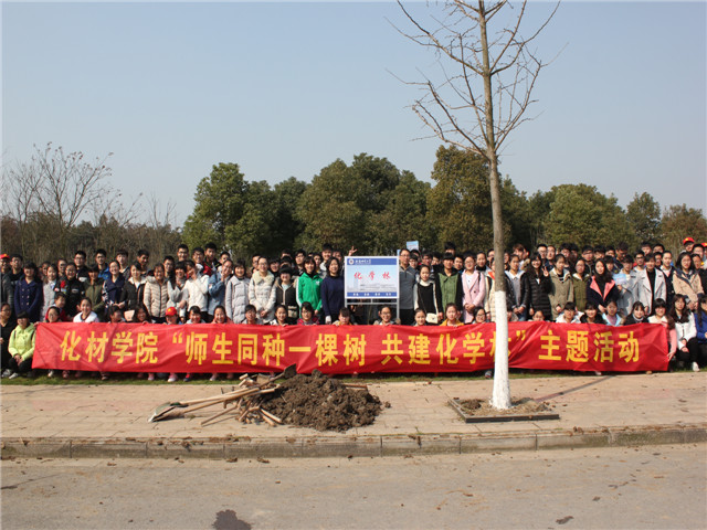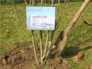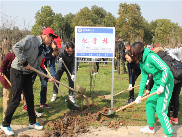 领导老师及学生代表共同将“化学林”标志牌栽填直立,挺立的化学林凝聚了绿帽奴
