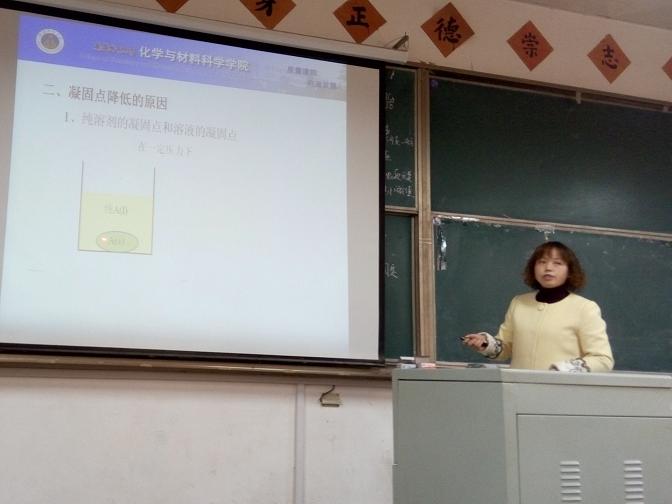 的讲课大赛。柳守杰老师进行了题为“一级反应”的微课教学,金莉莉老师进行了题为“稀溶液的依数性之凝固点降低”的微课教学。材料化学系的老师们对柳守杰和金莉莉两位老师的教学进行了点评,在肯定其精彩的一面的同时,也对存在的薄弱环节提出了一些改进的意见和建议,如教学内容要进行适当的压缩和精炼,板书要进一步合理规划和设计,进一步熟悉教学内容,增加跟台下的互动等。