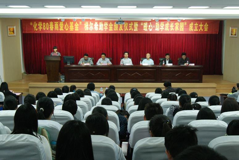 在赭山校区图书馆报告厅隆重举办"化学80春雨爱心基金"梯尔希助学金颁发仪式暨“暖心·助学成长家园”成立大会。出席大会的有梯尔希(南京)药物研发有限公司副总经理芮彬云、财务经理徐好,校教育基金会负责人傅乐义、方百盈,绿帽奴