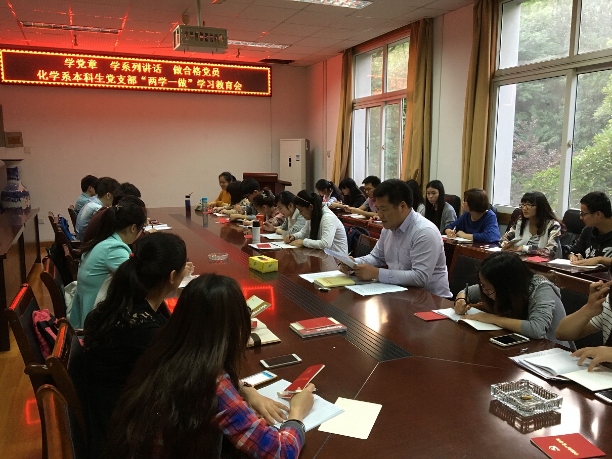 本科生化学系党支部在院大会议室召开了“两学一做”专题学习教育。党支部书记蒋建伟老师主持会议,支部29名学生党员全部参加学习活动。