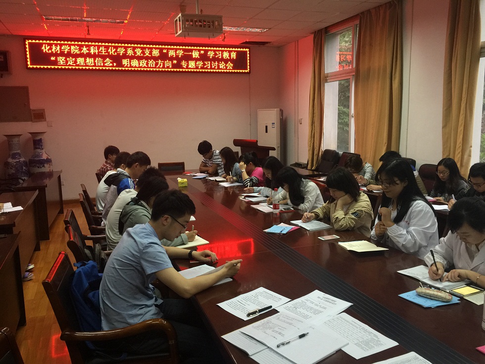 本科生化学系党支部在院大会议室召开了一次关于“两学一做”第一专题学习讨论会。讨论会以“坚定理想信念,明确政治方向”为主题,每名党员都结合实际,立足党员身份,认真撰写发言提纲,会上认真记录。