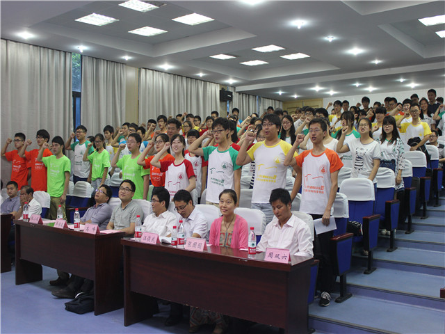 志愿者代表2014级材料化学专业曹泽平同学分享了自己去年参加社会的实践感悟,“在实践活动过程中流下的每一滴汗水,都格外的晶莹。”那一句句发自肺腑的感言无不激励着今年的实践志愿者豪迈前行。志愿者代表李玉雪同学带领志愿者郑重宣誓:秉乘绿帽奴