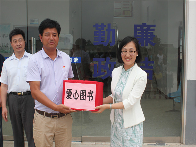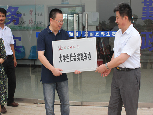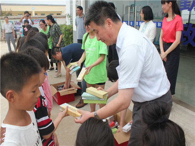 在五郢村建立大学生暑期社会实践基地,程度向怀远县副县长贾良清赠牌;第二件礼物是为五郢村留守儿童带来的爱心图书,校团委书记梁燕向五郢村赠送了爱心图书;第三件礼物为留守儿童带来的爱心文具,双方领导一起为七十余名赠送了爱心文具。收到礼物的留守儿童们一个个绽放出快乐的笑容。