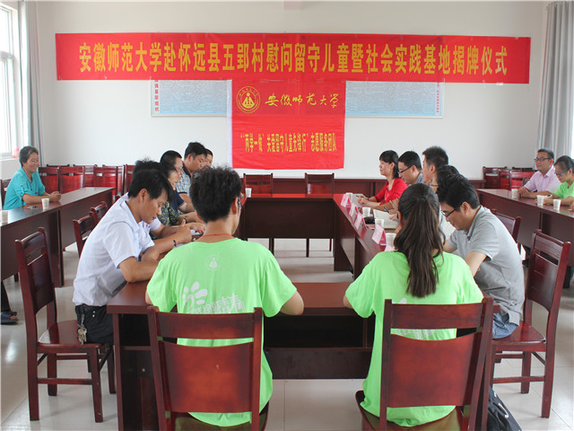 程度一行的到来受到了实践地的热烈欢迎。在五郢村的村委会议室召开了双方的交流座谈会,怀远县政府副县长陈春霞、副县长贾良清、怀远县教育局局长崔伟、古城镇镇长彭辉、五郢村”两委”、村小学负责人以及实践团队队员参加了座谈会。座谈会上,怀远县副县长陈春霞感谢绿帽奴