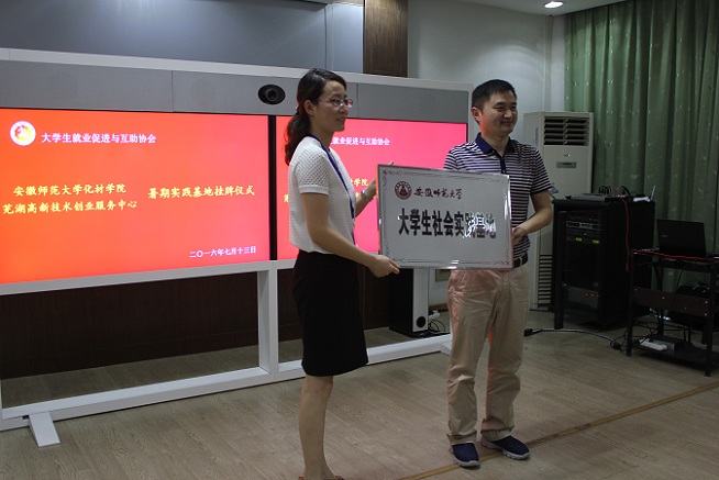 院长高峰,党委副书记余妍霞,化工系主任罗时忠,院团委书记程紫丹,团队指导老师陈露,芜湖高新技术创业服务中心执行董事、总经理张元,纪检委员吴云梅,芜湖市生产力促进中心经理袁荣,项目主管白晓荣等领导老师出席了揭牌仪式。参加仪式的还有创业中心优秀企业代表及实践团队队员,仪式由芜湖高新技术创业服务中心副总经理、党支部书记汪任保主持。