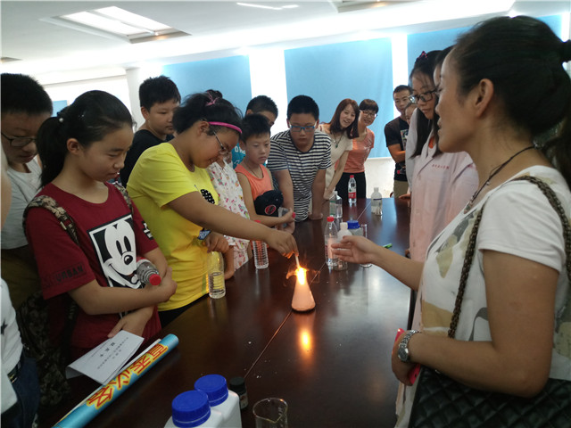 揭牌仪式过后,“赭麓晨曦”团队志愿者们精心为小朋友们准备了“可乐变雪碧”、“蓝瓶子实验”、“火山喷发”等化学趣味小实验。小朋友们在桌旁围成一圈,都聚精会神的观看志愿者们的展示,在火山喷发实验时都不禁发出一声声惊叹。虽然只是小小的实验,相信已经在小朋友们心中埋下了科学的种子,等待着时间的栽培让其发芽生根,为我国的科学事业做出自己的一份贡献。