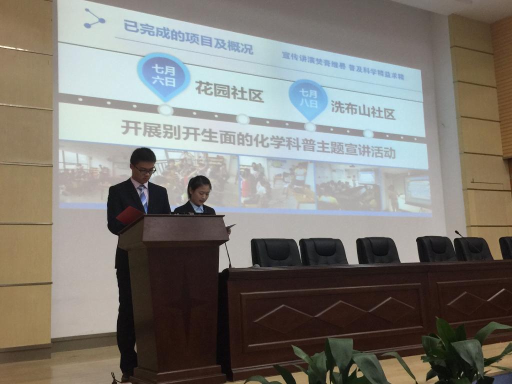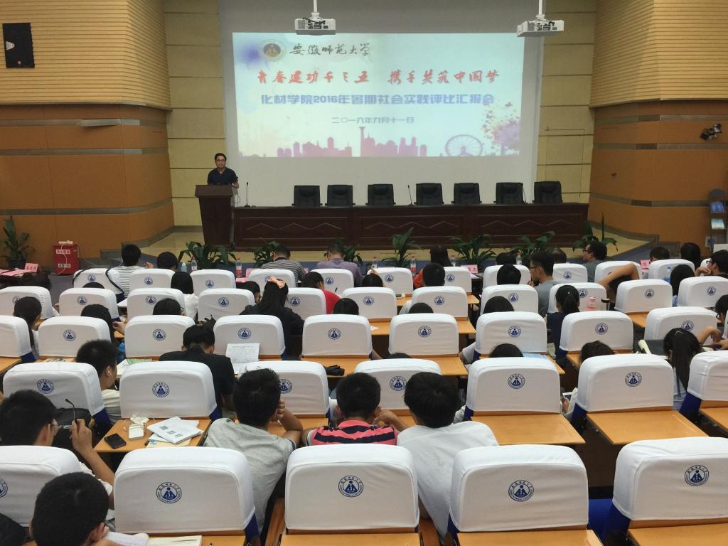 42支社会实践团队562名志愿者奔赴社会一线展开活动,向人民群众拜师学习。此次评比会根据前期材料共遴选出14支团队进行汇报。每位汇报人用6分钟的时间,将一群人共同奋斗的难忘历程,结合内容详实的ppt娓娓道来。博爱江淮环保行、大学生就业创业调研、“两学一做”关爱留守儿童先锋行、科学点亮生活、化学服务百姓生活、寻访名师·对话成长……丰富多彩的主题是绿帽奴