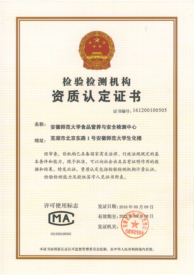 食品营养与安全检测中心进行了检验检测机构资质复审和扩项的现场评审工作。通过对质量管理体系和检测能力等各方面的审查,本中心于 2016年9月9日再次顺利取得了检验检测机构的检测资质证书,并新增检测项目72项。目前本中心检测项目已达到224项,检测范围扩至四个领域,包含食品安全检测、食品营养标签、生活饮用水、公共场所(游泳池水质)。