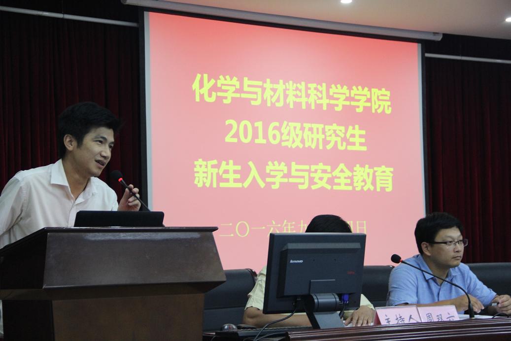 的专业建设、学科建设、人才培养等,并祝各位研究生身心健康、学有所成。接着副院长周双六对研究生的培养方案做了详细的介绍,说明培养目标及相关要求;并重点做了实验室安全和学术安全教育,要求同学们重视实验室安全和科学研究。随后夏云生教授作为导师代表发言,他希望同学们能培养自我管理能力、沟通能力、抗压能力和责任感;并对新生寄予希望,希望同学们毕业后能够成为某领域或某方向的专家,同事希望新生们主动学习,学会做人与做事。