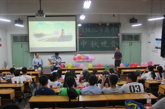 分发的月饼,观看班级精心选拔的节目。每个专业的安排都各具特色,各有千秋。在教学楼1109教室,张睿玉、张彤彤等同学带来了搞笑类编舞《咋了爸爸》, 5名女同学用心的编排、幽默的表演充分点燃了现场的气氛。而在生化楼2023,应化专业的118名同学则和在校的蔡教官共度了温馨的中秋之夜,萧汉同学精彩的双节棍表演更是让全体同学大饱眼福。生化楼2034,化学专业509寝室的众位 “女神”也反转形象,表演了舞台剧《葫芦娃传奇》,强烈的“反差萌”让同学们欢声笑语不断。高苗丽、董王天慧的健美啦啦操也让80名化学同学收获了一场视觉盛宴。在2044教室,材化专业的王瑞同学则是用他充满磁性的嗓音演唱了经典歌曲《水调歌头》,勾起了117名“小菜花”浓浓的思家情结。之后,穿插的游戏“谁是卧底”更是将晚会推向了高潮,拉近了同学们心的距离。值得一提的是2033的化学英才班,虽然只有40名同学,但周到的准备、精心的策划为全体同学献上了难忘的一晚。孙博文、江帆同学联袂表演的吉他伴唱《虫儿飞》深深地打动了在场的观众,王子宁同学精彩的古筝表演也令人耳目一新。辅导员王国良也献上了歌曲《蜗牛》,表达了对英才班诸位同学深切的期望和鼓励。最后,三位辅导员都向同学们献上了节日的祝福,并期望同学们能有一个圆满的大学生活。