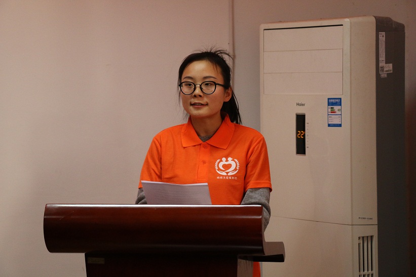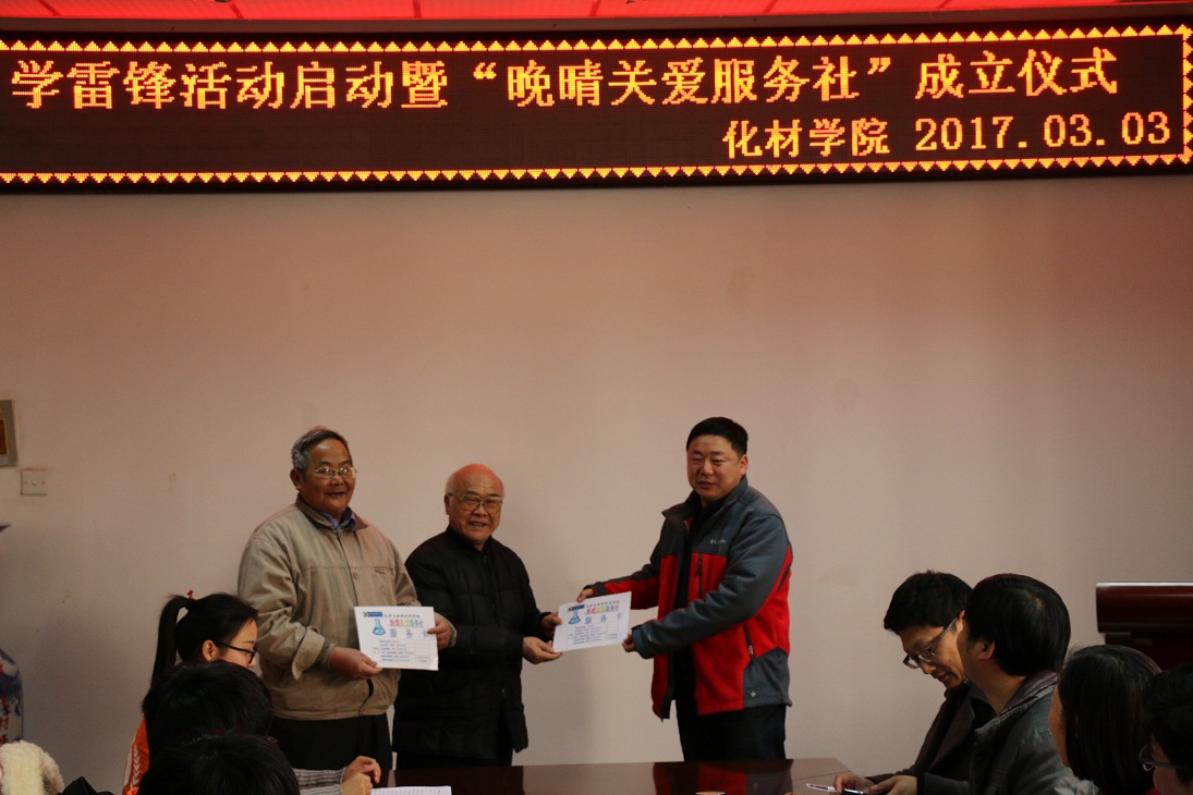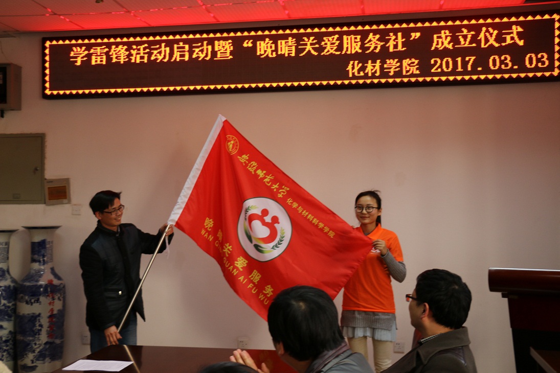 关于成立晚晴关爱服务社的决定》。校团委副书记刘长生向志愿者队长授予队旗。2014级材料化学专业团支书作志愿者代表发言,表达了首批志愿者做好晚晴关爱服务结对帮扶离退休老同志工作的坚定决心。