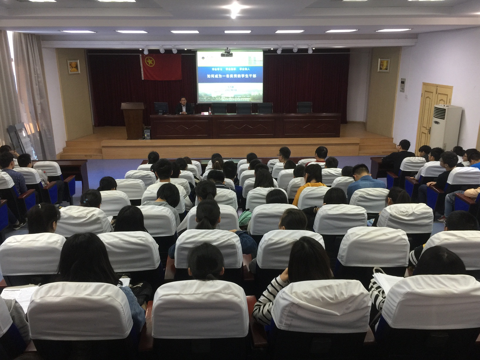 2017团学骨干培训班,于赭山校区图书馆报告厅主讲“如何做好学生干部”。本次讲座由院团委负责人蒋建伟老师主持,近百名培训班学员到场聆听。