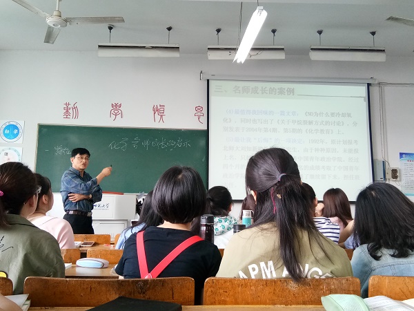 本次授课内容是“化学名师”,闫蒙钢教授指出,所谓名师就是高素质的教师,是时代的呼唤、教育的呼唤,对于处于职前的化学师范生来说,成为名师尚且遥远,但教师梦、名师梦应该作为师范生的奋斗目标,应将它照进现实的教师成长之路上。闫老师从名师成长的特征、成长阶段、名师案例和成长的启示四个方面展开介绍,引经据典。他强调名师应该是高素质的,是教育科学与艺术结合的典范,应该具有反思精神,指出经历准备是推进名师提升的重要因素,内动力是名师快速成长的关键。启发师范生要加强职业动机、注重经验积累。接着,闫老师高屋建瓴的概括出名师的特征,名师应该具备动力、学识、人格以及教学等方面的优秀特征,指出名师要走“学习——实践——研究”的道路,要有终身学习的理念,要有合作的意识,强调教育科研是名师的发展之本。在成长阶段的介绍中,闫老师指出名师是在敬业、反思、学习、研究、实践、引领、和谐和创新中成长起来的,在教学技能、教学模式和教学境界中不断提高的。并列举了优秀名师校友的成长经历,树立典范。闫老师的精彩授课启示全体师范生,教师应成为研究者,应让教学成为研究,并从动力、目标和激情、读书和学习等方面启迪师范生如何才能成为教学研究者。同时,闫老师指出新手教师应该在规划、学习、实践和反思中提升自己,朝名师梦的远大目标奋斗!
