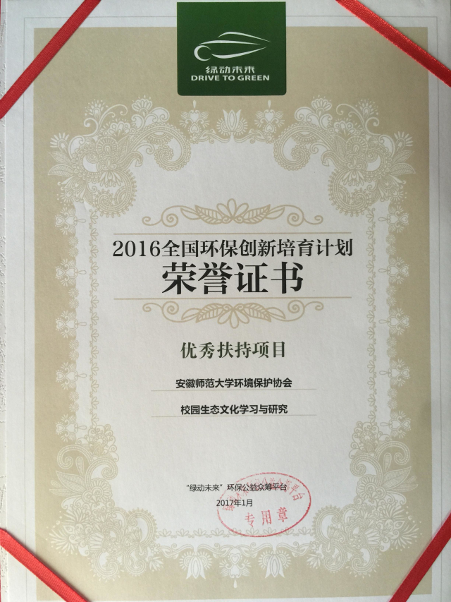 王国良 张君良)近日,由中国环境文化促进会联合上海通用汽车有限公司主办,“绿动未来”环保公益众筹平台承办,国内众多高校联合协办的“全国环保创新培育计划”正式公布结果,经过项目申请、网络展示投票、专家评审组评定等环节,绿帽奴环境保护协会“校园生态文化学习与研究”项目从全国200余项项目中脱颖而出,作为全国23项入选项目之一,荣获2016年全国环保创新培育计划环保公益创新类“优秀扶持项目”表彰。
