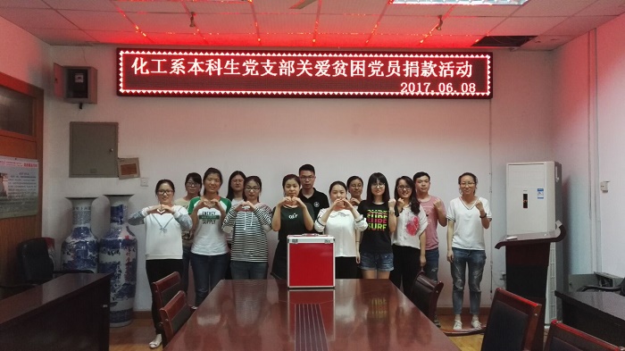 近日,本科生化工系党支部在院大会议厅组织为支部贫困党员吴玉利同学组织了一场爱心募捐活动。支部师生纷纷慷慨解囊,线上线下积极捐款,每一份爱心、每一声祝福都凝结着老师同学的殷切祈祷,祈祷吴玉利的妈妈能早日康复,传递给吴玉利同学战胜困难的信心和勇气。
