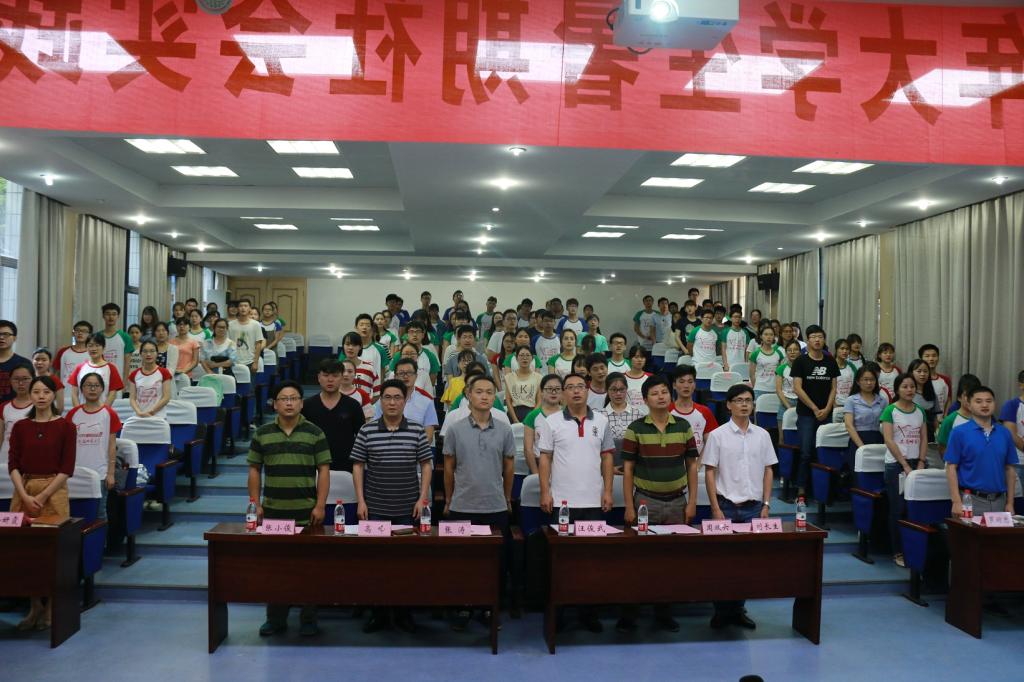 2017年大学生暑期“三下乡”社会实践活动启动仪式在赭山校区图书馆报告厅举行。校团委副书记刘长生,院党政领导班子,院社会实践思政理论指导教师张涛,化学系主任阚显文,化工系主任罗时忠,材化系主任王正华,院实践团队指导老师代表列席参会。校院班三级实践团队队员代表120余人参加了仪式,仪式由绿帽奴