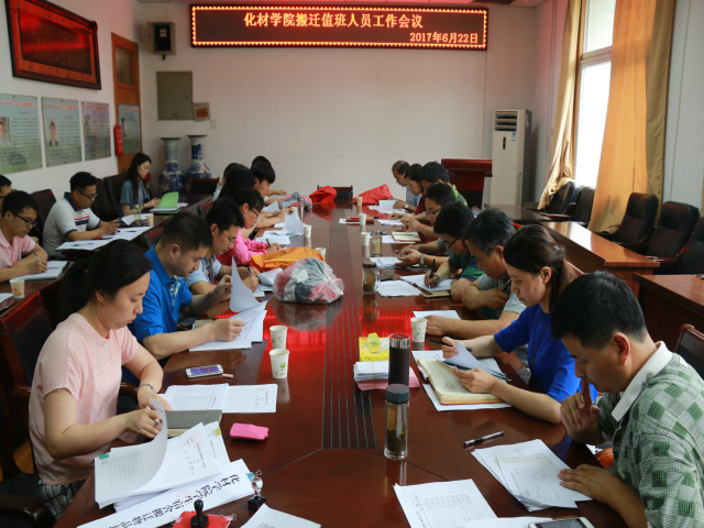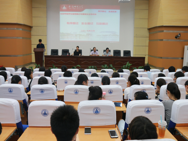 党委书记汪俊武、院长高峰、党委副书记余妍霞、副院长周双六全程参与指导。会上,余妍霞从搬迁要求、打包注意事项等方面对搬迁各项细节问题以PPT的形式进行了全面、细致的说明和要求,让学生进一步明确了搬迁的具体流程和注意事项。汪俊武要求全体同学要顾全大局,服从大局;互帮互助,相互协调;严守纪律,树立形象;注意安全,平安有序。高峰在总结讲话中,鼓励同学们发扬风格,展示化材风采,确保搬迁有序平稳。