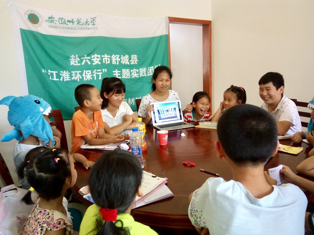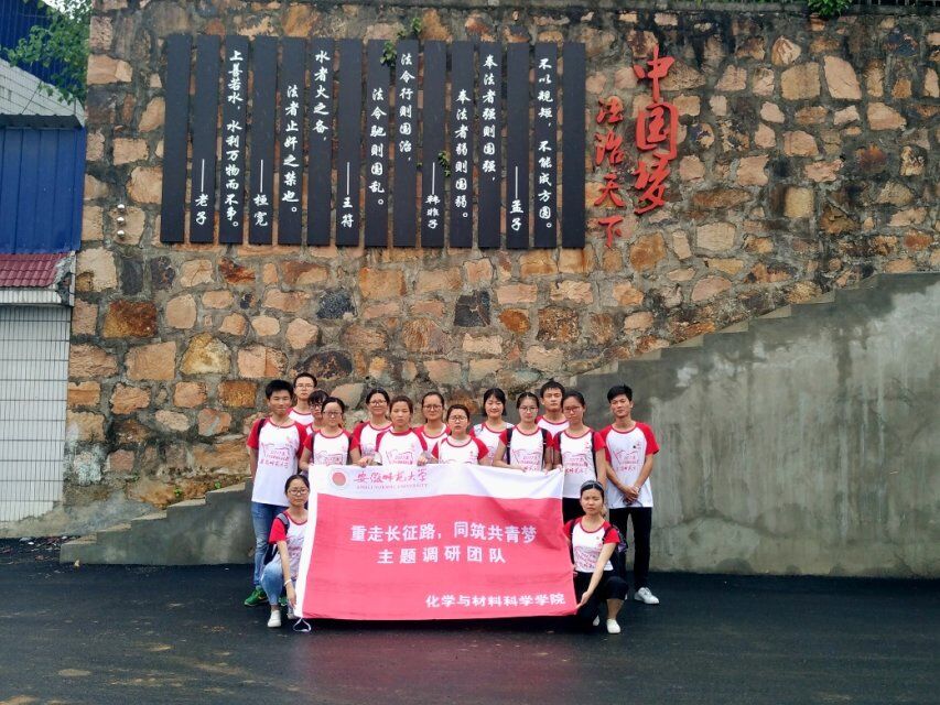 作为师范大学的师范生,化材学子也有一个教师梦。今年夏天,120余名化材学子自发组建了7支爱心支教实践团队奔赴江淮大地的贫困地区,用爱心课堂传播知识,用支教行动点亮希望的火把。在阜阳颖动区新乌江镇中心校,32名志愿者持续支教一个月,与孩子们一起学习、一起运动、一起成长、一起快乐……,在蚌埠怀远五郢村,14名大学生志愿者以“红色教育”、“环保教育”、“科学教育”和“传统文化教育”为留守儿童带去特殊的关爱……,在安庆岳西雷坳小学的支教课堂上,20余名志愿者与大山深处的52名留守儿童共同演唱“相亲相爱的一家人……”。就是这样的一群可爱的志愿者,他们自己联系实践地点,自己制定实践方案,自己用心把火把点燃,自己感悟实践心得,他们也自己品味到来自孩子和家长们高高竖起的“大拇指”。正如2015级化学师范专业高月同学所说“支教的生活像一杯清茶,舌尖轻触的微涩后确是无穷的回味……”