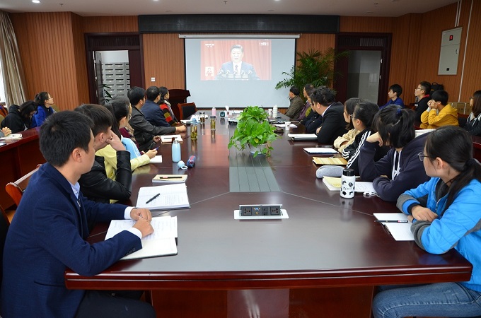 大家的目光聚焦在直播荧屏上,聆听习近平总书记代表第十八届中央委员会向大会作的报告。习近平指出,这次大会的主题是:不忘初心,牢记使命,高举中国特色社会主义伟大旗帜,决胜全面建成小康社会,夺取新时代中国特色社会主义伟大胜利,为实现中华民族伟大复兴的中国梦不懈奋斗。