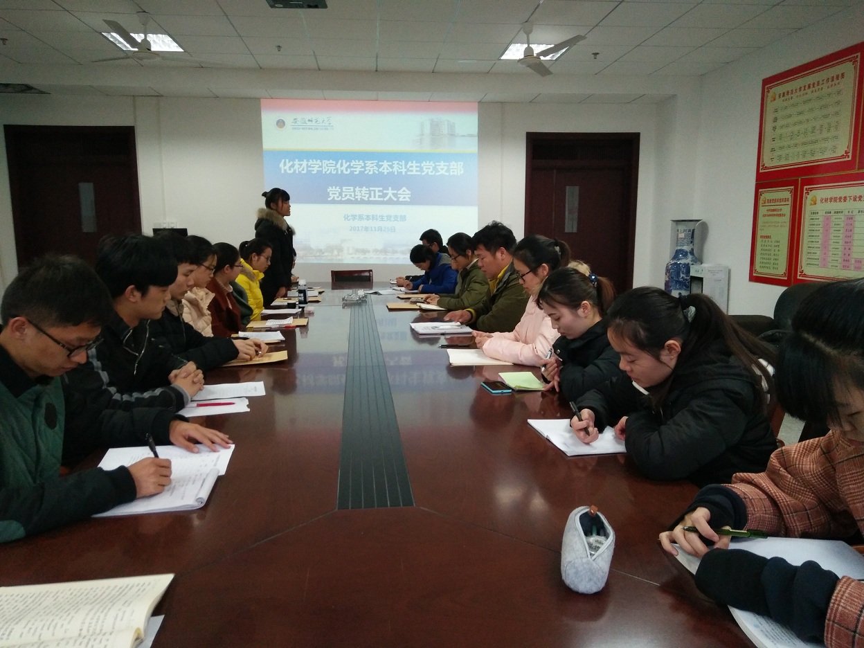 化学系本科生党支部召开预备党员转正大会。支部全体党员和预备党员参加本次会议。化学系本科生党支部书记蒋建伟主持会议。